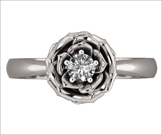 14K Flower Ring, Solitaire White Gold Diamond Rose Ring Flower Ring Leaves Ring