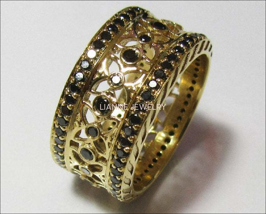 18K Gold Wide Eternity Black Diamond Filigree Ring, 124 Black Diamonds