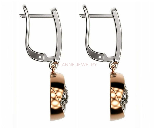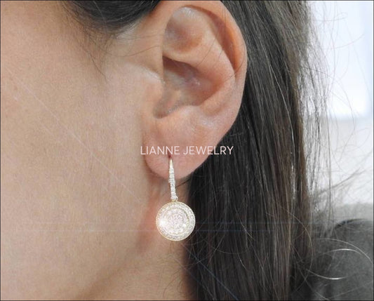 Anniversary Gift 2 Tone Dangle Circle Leverback 14K Diamond Earrings Round Hanging Pave Earrings Wedding Earrings Diamond Round Earrings