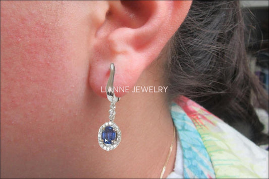 Lever back Vintage Earrings Oval Sapphire surrounded Diamonds Birthday Gift Woman Earrings Edwardian Earrings Drop earrings 14K White Gold
