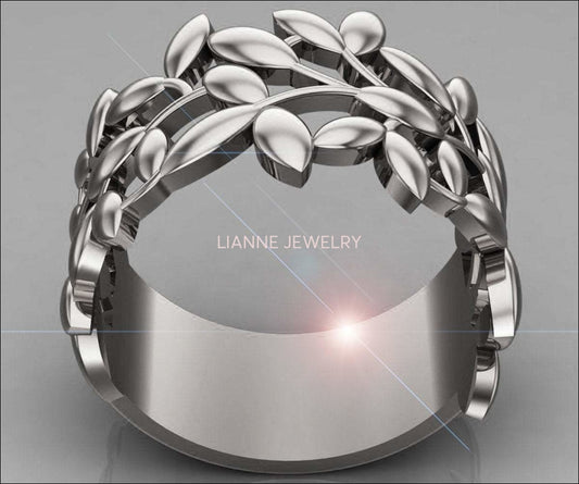 18K White gold Leaf Ring, Branch Ring Band, Flower Band