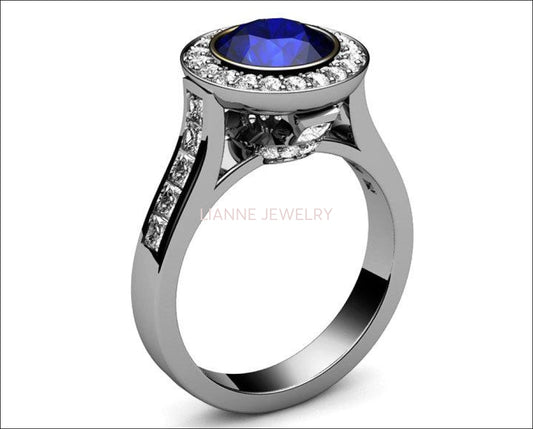 Sapphire Engagement Ring Cathedral channel frame Pavé halo ring 18K Yellow gold Jewelry marriage anniversary ring