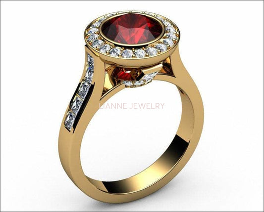 Ruby Engagement Ring Cathedral channel frame Pavé halo ring 18K Yellow or White gold Jewelry marriage anniversary ring