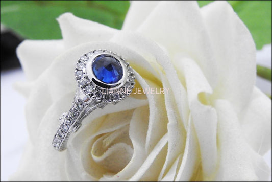 Sapphire Engagement Ring, Diana Ring, Diamonds surround Oval Blue Sapphire, Vintage style Ring