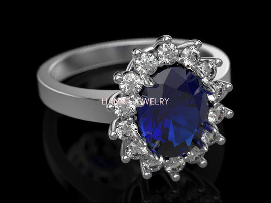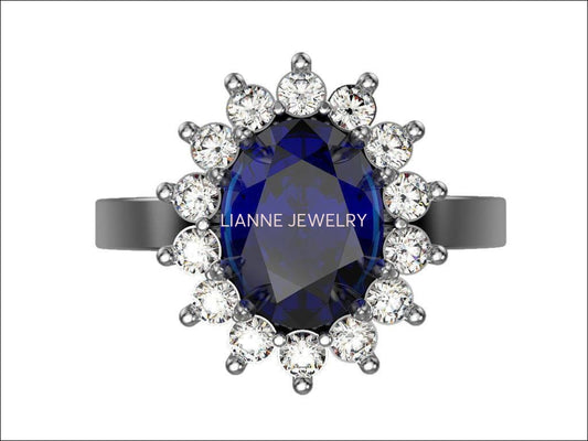 Gold Cocktail Sapphire Ring, Princess Diana Ring, Cocktail Anniversary Ring, Oval Halo Royal Ring