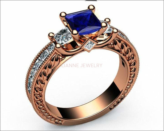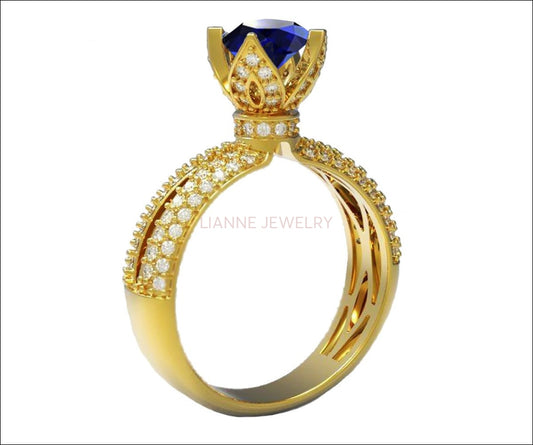 18K Rose Gold Sapphire Crown Ring, Filigree Solitaire Sapphire Ring, Royal Ring, Pave-set