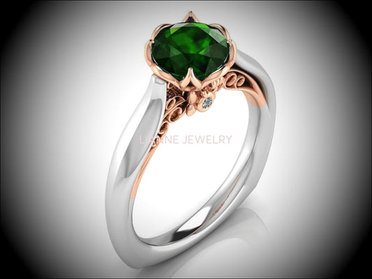 18K 2 Tone Emerald Engagement Ring, Milgrain Solitaire Ring Filigree Vintage Style