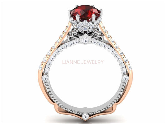 14K Gold 2 Tone Ruby Engagement Ring, Ruby Solitaire Ring, Filigree Vintage Style Ruby Ring