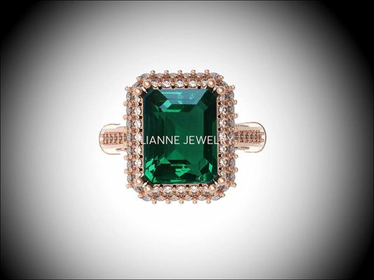 18K Rose Gold Emerald Emerald cut Engagement Ring surrounded with Diamonds