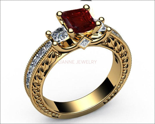 18K Ruby Gold ring Unique Ruby Diamond Engagement ring 3-stone Ring channel-set