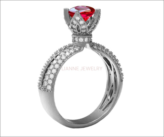 18K Ruby Crown Ring Filigree Solitaire Red Ring, Split Shank Pave setting Ring