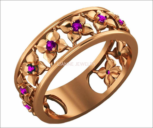 Amethyst Rose Gold Wedding Purple Flower Eternity Wedding band Ring Art Nouveau Leaf ring Filigree band Purple Floral Jewelry Wedding gift