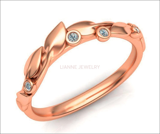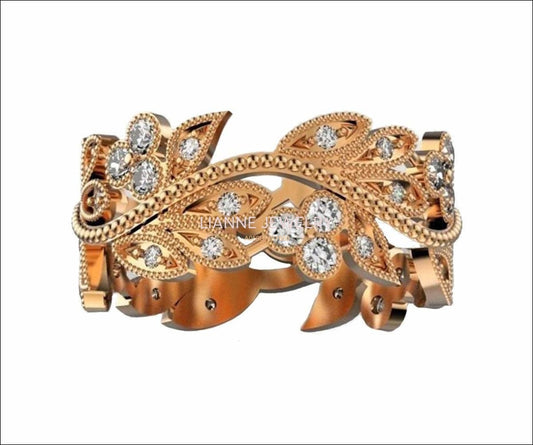 18K Rose Wedding Band, Filigree Band Ring, Diamond Leaves Ring