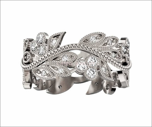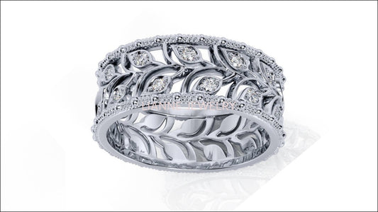 18K White Gold Filigree Band, Diamond Leaves, Anniversary Gift
