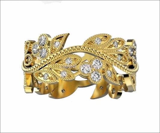 Rose gold Leaves Wedding Band Wide Band with Diamonds Leaf Floral Band Ring Birthday Gift Wedding Ring Band Milgrain