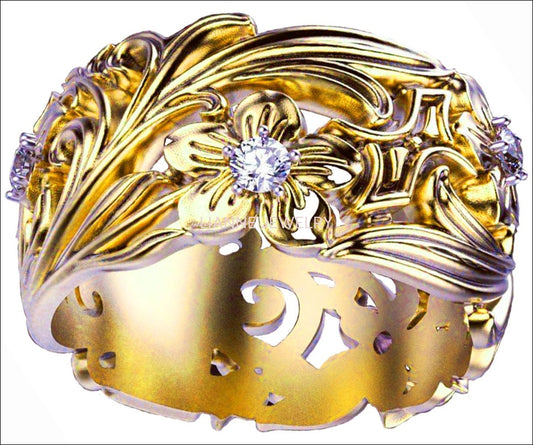 Rose Gold Wide Flower Band, Filigree Leaves Ring, Plumeria Ring