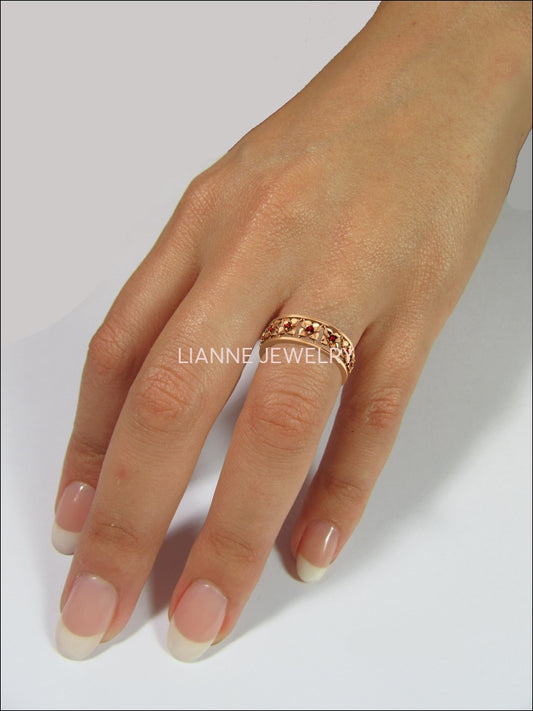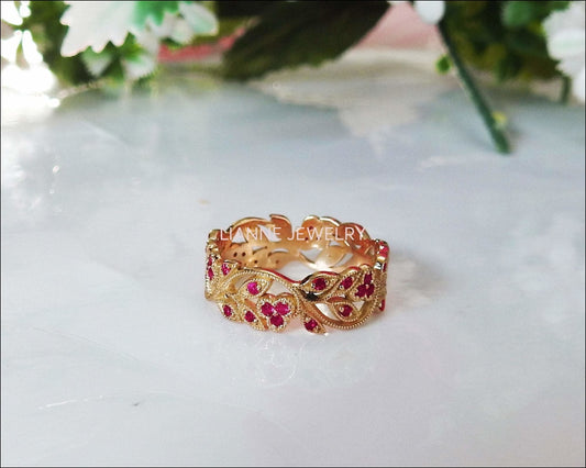 18K Rose Gold Red Flower Ring, Ruby Eternity Ring