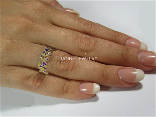 Purple Filigree Leaves Band 18K Rose gold Amethyst Milgrain Twig Ring Gift for Her